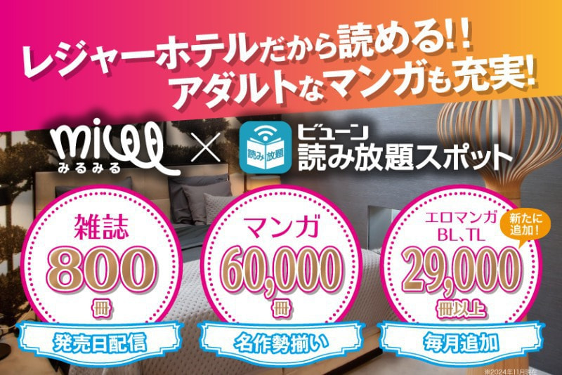レジャーホテルに特化させたサービス「みるみるビューン」が利用可能!お持ちのスマホでwifi接続すれば、使い慣れたいつものスマホでマンガが読み放題で楽しめます。